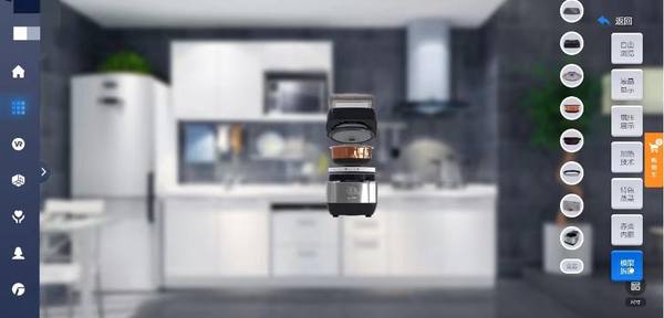 结合数码家电产品3D模型,用户可以720°旋转缩放查看产品材质及内部结构和科技原理,并可自由切换产品颜色,查看产品与房间空间的搭配效果。