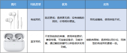 从上表我们可以看出,蓝牙耳机和有线耳机的优劣势都是比较明显的,蓝牙耳机使用更方便,有线耳机音质传输更无损。