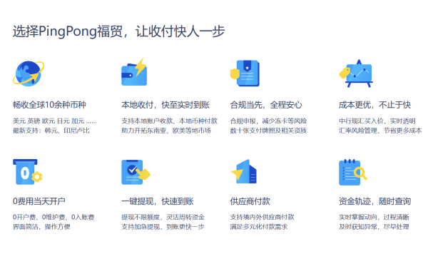 为切实解决庞大市场需求,PingPong福贸推出了全链路数字化出海解决方案,结合PingPong在全球数字支付领域的经验积累、风控专业度、行业技术稳定性及合规性等诸多优势,不仅能为商家提供全球账户的开户,还能为其提供本地收款账户,让外贸收付款更安全。