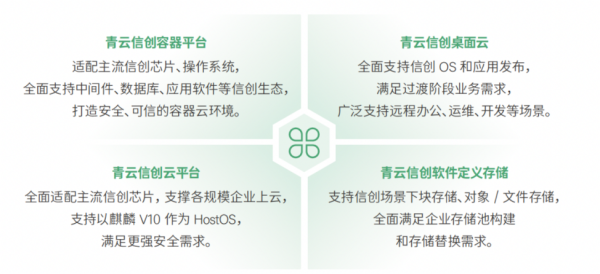 对此,青云科技提出了全栈全场景的理念,在产品端包括四大方向:底层为青云信创软件定义存储和信创云平台,前者支持信创场景下的块存储、对象/文件存储交付,帮助企业构建存储池,支持非信创存储替换需求,后者全面适配信创x86、ARM芯片,支撑企业基础架构上云,支持以麒麟作为服务器操作系统,满足商密、国密等安全需求。上层接近应用层,为信创容器平台和信创桌面云,前者同样适配x86和ARM芯片(裸金属或云平台部署),全面支持各类信创操作系统,以及中间件、数据库、应用软件等信创生态建设,打造安全、可信的容器云管理环境,后者支撑信创OS(统信、麒麟等)和应用发布,满足过渡阶段业务需求,支持远程办公、运维、开发等场景。