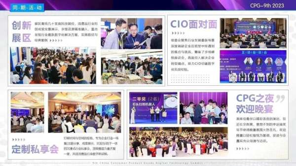 CPG 2023第九届中国消费品数字科技峰会同期将举行创新展区、CIO面对面、定制私享会、“CPG之夜”欢迎晚宴 等。