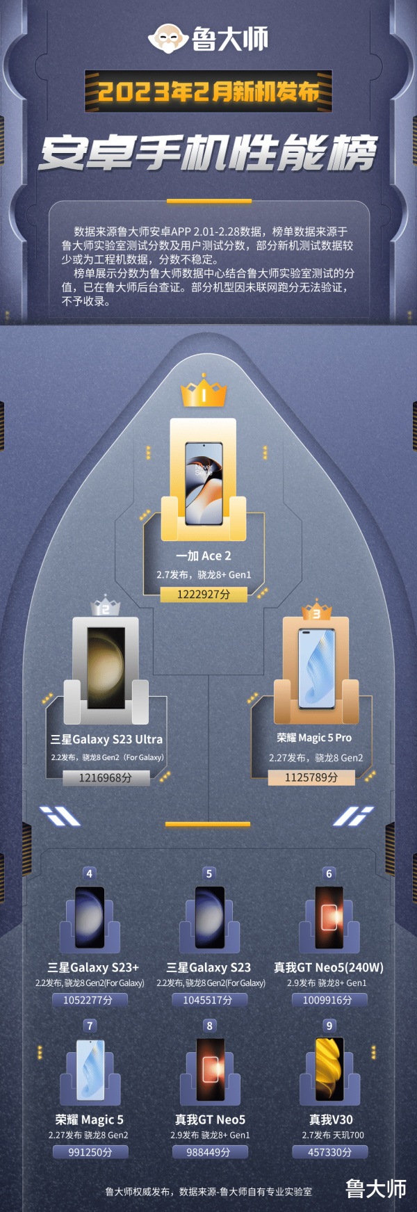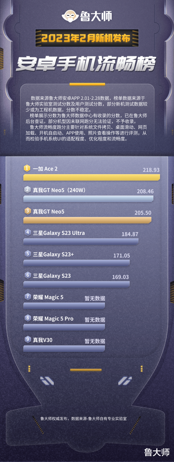 1. 数据来源鲁大师安卓APP 02.01-02.28数据,榜单数据来源于鲁大师实验室测试分数及用户测试分数,部分新机测试数据较少或为工程机数据,分数不稳定。