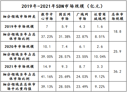 计世咨询发布的《2021-2022中国SDN市场发展状况白皮书》中,2019-2021年中国SDN市场整体统计数据表示:SDN市场细分为数据中心市场、园区网市场、广域网市场、运营商城域网市场四个部分。数字中心市场约占总体市场39.13%,园区网市场约占总体市场28.55%、广域网市场约占总体市场23.49%、运营商城域网市场约占总体市场9.22%。