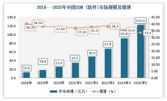 根据观研天下最新发布的《2018-2025年中国SDN(软件)市场规模及增速》报告显示,2021年预测市场规模为35.5亿元,2022年预测市场规模49亿元。