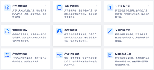 目前,领动智文应用已经接入了9类文本创作工具,包含“产品详情描述”“通用文章撰写”“公司介绍”“文章内容改写”“询盘回复建议”“展会邀请函”“产品应用场景”“产品分类描述”“Meta描述文案”等。