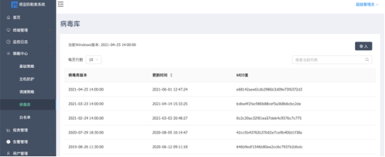 病毒库:内置勒索病毒与挖矿病毒库,由美创59号实验室持续搜集国内外勒索病毒和挖矿病毒信息,不断更新,支持病毒库导入,保证病毒库的最新有效性。