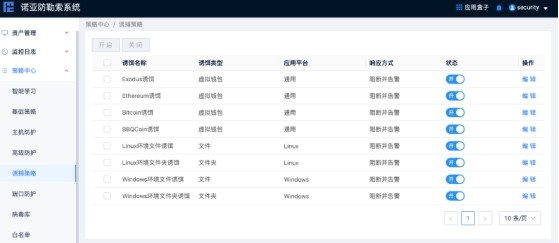 未知病毒诱捕:鉴于勒索病毒的无差别广谱特征,诺亚防勒索内置病毒诱捕系统,精确识别勒索病毒的入侵。