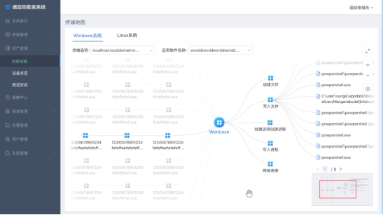 诺亚防勒索应用实时地图对所有应用进程的访问逻辑关系进行全面精细的可视化分析,直观展示可疑病毒行为轨迹,以进程事件树的方式将可疑进程的孵化关系、文件操作、注册表修改和网络行为绘制展示,帮助安全运维人员更加直观地分析恶意进程运行操作路径,提供一键策略配置能力,快速应对风险,提升安全事件分析和处置的效率。