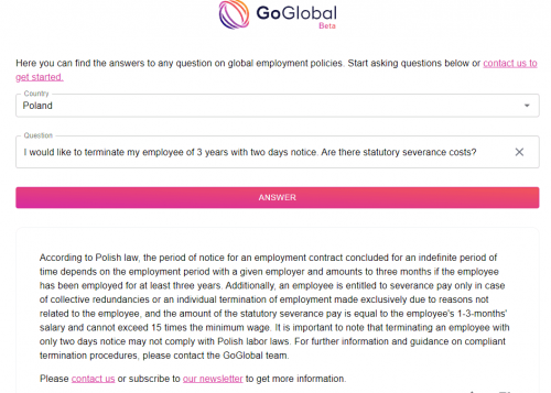 通过结合 GoGlobal 对 100 多个国家人力资源法规信息的广泛数据库,ChatGoGlobal 为寻找有关全球员工的信息的企业提供了一个全新的 AI 工具。 GoGlobal 是第一家提供这种 AI 聊天机器人的全球名义雇主(EOR)服务提供商。