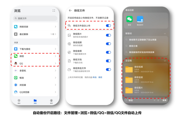 华为智慧搜索这个桌面级的搜索入口不仅支持丰富的本地搜索,P60系列设备还支持搜到华为云空间云盘里的文件内容。需要使用文件时,我们可以直接通过手机下拉智慧搜索输入文件/压缩包标题,一步直达所需文件。用微信收发文件已是大多数职场人的日常,其中确保文件不丢失、需要用时快速找到尤其重要,这里推荐用华为云空间的云盘来备份文件,只要在文件管理开启“微信/QQ文件自动上传云盘”功能,就能随时备份微信里保存过的图文视频等文件。这样不仅不用担心文件丢失,还可以把手机内存腾出来保存P60拍的生活美照。无论是准备给下属下达工作需求,还是给领导复盘汇报,都能快速找到相关资料,提高工作效率。