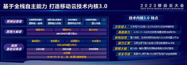 据了解,全新升级后的移动云以“智”“信”为内核, “算力、连接、定制、安全” 为核心关键词,提出“算力网络”理念和“网络无所不达,算力无所不在,智能无所不及”的愿景,并重磅发布 具有泛在接入、海量算力、异构协同、能力汇聚、算网大脑、安全可信六大特点的 “技术内核3.0” , 打造并落地新一代超级算网大脑; 面向算力网络打造新型信息基础设施,全力打造一朵智能、智慧、安全可信可控的“云”。