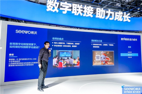 “这几年来,我们在推进教育数字化的过程中,逐渐体会到‘找到并解决老师在教育教学中的痛点是有效推进教育数字化建设’的重要手段。”随后,姜主任分享了他们是如何通过找痛点来快速推进希沃一体机的使用。