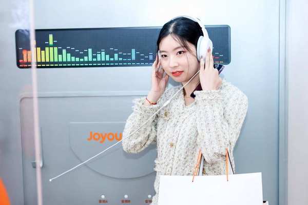 (参会者在听音房间体验九阳变频轻音破壁机B1的声品质)