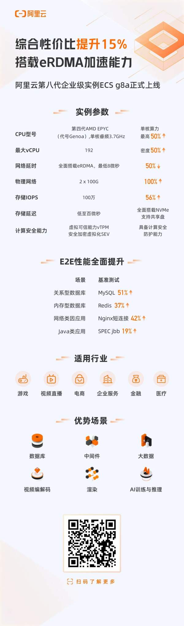 其中,第八代企业级通用计算实例 g8a,单核睿频达 3.7GHz,单核算力相比上一代最高提升达 50%,综合性价比平均提升 15% 以上。主要面向泛互联网行业,适用于数据库、中间件、Web 网站等通用企业级应用,高清视频编解码、渲染、AI 训练与推理等互联网场景,综合性价比提升 15%。在 MySQL 数据库场景,性价比可以提升 35%;在 Redis KV 数据库场景,性价比可以提升 20%;在 Ngnix 企业级应用场景,性价比可以提升 25%。
