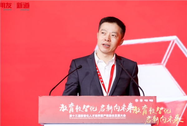 新道科技股份有限公司副总裁贾大明以“教育数智化启新向未来”为题进行演讲。他表示,数字中国已经走深走实,数字教育正在开启新程,教育数智化将走向数智化、融合化、协作化、国际化。突破路径依赖,跳出教育看教育数智化,立足全局看教育数智化。教育数智化的核心是教学,教育数智化不是单纯的智慧校园,不是技术与教育的简单叠加,而是对教育深度的变革重塑。贾大明介绍,新道科技打造了数智工科、数智财经、数智财经、新双创四大数智教育体系以及DBE Cloud 数智实践平台,AIE数智商业综合实践平台,新道教育元宇宙实验实训平台,青椒课堂平台,S+ Cloud认知实践平台五大产品。新道科技以数字产业领跑教育数智化,从内容层、应用层、平台层、环境层四个方面为院校提供校级数智化教学改革方案。他表示,教育数智化需要携手产业,共同完成范式跃迁;并拥抱头部企业,立足数字中国,服务产业升级,共创数字教育。