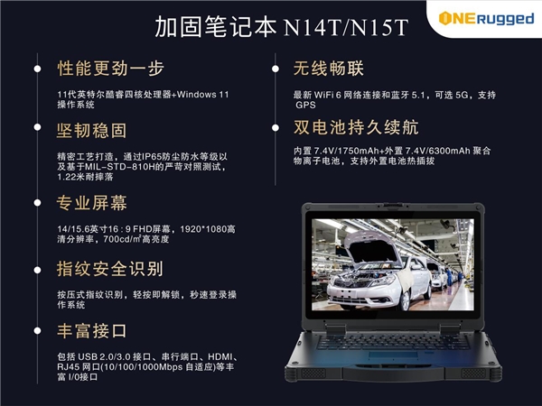 专为严苛条件使用而设的ONERugged N14T和N15T加固笔记本通过了实验室的独立严格测试,符合IP65防水防尘保护等级,美军MIL-STD-810H标准,能在-20摄氏度到60摄氏度的极端温度下正常工作,运行时即使在1.22米高度下摔落都不会中断它们的运行,面对工业制造、测绘、石油化工等各行业苛刻的工作条件也保持稳定和数据安全,N14T和N15T毫无疑问地提供了更为坚实可靠的信心保证。