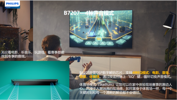 当下,年青人走进电影院观影已是一件寻常事,为的就是一个被声音包围的现场体验感。但对于视听效果有着极致追求的人,他们更想把影院“搬”回家。在不被外界因素打扰的舒适家里也能享受到影院级高品质音效视听,这才是他们真正想要的奢华体验。与其把影院“搬”回家,不如把飞利浦B7207带回家,更能有效实现视听强效合一带来的身临其境体验感。观影时,带你直接体验电影院般的多维度动感。