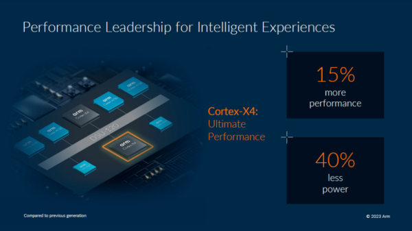 而且根据Arm公布的信息来看,基于Armv9的Cortex-X4超大核将再次突破智能手机的性能极限,相比X3性能提升15%, 基于相同工艺的全新高能效微架构可实现功耗降低 40%。而Cortex-A720将成为明年主流的大核,可提高移动芯片的持续性能,是新CPU集群的主力核心。
