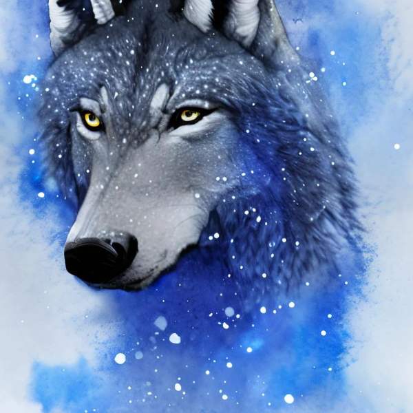 水彩画:巨狼,飘雪,蓝色大片烟雾,毛发细致,烟雾缭绕,高清,3d,cg感,侧面照