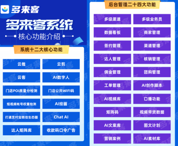 那多来客系统是干什么的呢?只是他的品牌叫多来客。实际这个多来客就是专业给本地生活服务商做系统解决方案的。从最初的定位就可以看出“认真做交付,专业孵化本地生活服务商”,而且最让人满意的是多来客拥有自己的实战地推团队。每一个功能都是经过地推团队按市场需求和实战经验才上线的。再简单来理解就是,如果是本地生活服务商,可以买一套系统,娶一个自己系统的品牌。设置服务商参数,然后就可以脱离官方系统。可无限发展团队。无限发展渠道。无限开展全国业务。最重要的是利用系统数十项的强大功无需借助达人就能帮助商家做运营拓客。然而向这样庞大的系统,自身去开发的话,没有两三年的时间,是根本做不到的。即使有后来者,也难以来代替。