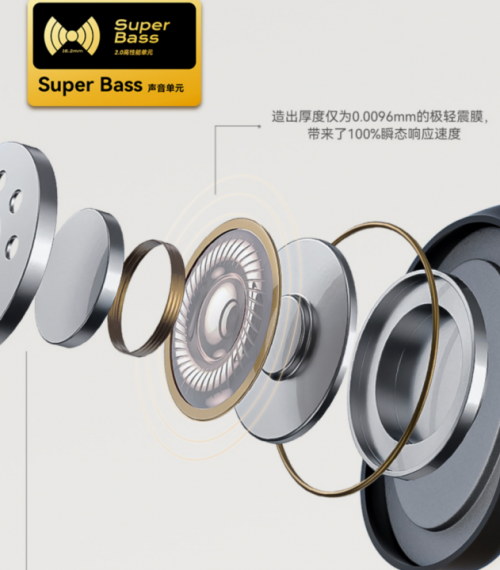 在耳机音质硬件上,OE PRO还拥有Super Bass 2.0高性能声音单元,这是一款极具创新的声音单元,它采用了高标准、高性能的定制化设计方案。这款声音单元应用了16.2mm大动圈单元发音结构和LCP流延钛聚合物材料,充分发挥了这种材料的优点,造出了厚度仅有0.0096mm的极轻震膜。