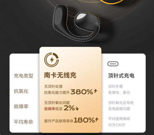 在开放式耳机里面,南卡引入了超前无线充电设计,这一举措不仅解决了行业痛点,同时也提升了产品的寿命和耳机的产品耐用性。