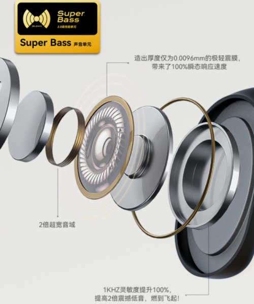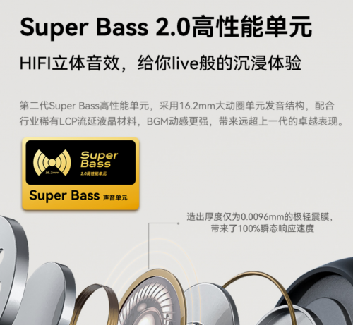 同时,采用定制版高通3040芯片,支持AptX无损音质传输的硬件配置上,还配备了由16.2mm大动圈单元发音结构与行业稀有的LCP流延钛聚合物材料以及厚度仅为0.0096mm的极轻震膜组成的Super Bass 2.0高性能声音单元,带来了100%瞬态响应速度,2倍超宽音域,1KHZ灵敏度提升120%,提供2倍震撼低音,声音还原度高,干净、通透,有感染力,更动感,更带劲。