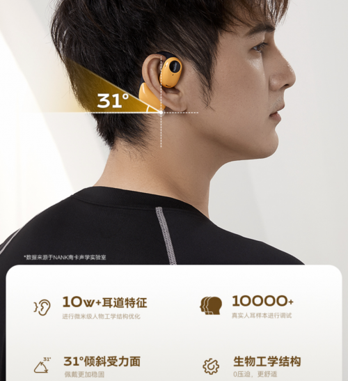 为了带来更好的舒适佩戴体验,采用了31度悬浮倾斜的耳机和耳挂结构,经过人体工程学设计,将压力分散并减轻到最低程度,实现佩戴时0压感、无感觉。