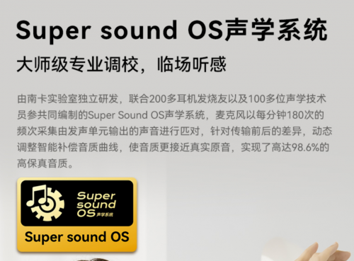 为了提升低频音质表现,南卡OE Pro引入了全新自研Super Sound OS声学系统,该声学系统由南卡实验室主导,并与200耳机发烧友、HIFI俱乐部以及100多名声学工程师共同研发,以每分钟180次的频次采集由发声单元输出的声音,并与设备的原音进行匹对,针对传输前后的差异,动态调整声谱特定频率,智能补偿音质曲线,使音质更接近真实原音,实现了高达98.6%的高保真音质,避免了千人千耳的主观因素,不挑耳,越听越好听。