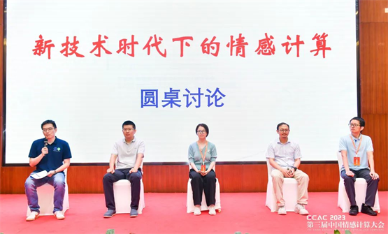 大会设立了前沿趋势论坛,来自中国科学院心理研究所杜忆研究员、西北工业大学夏召强副教授、中国科学院软件研究所彭晓兰助理研究员、北京理工大学毛先领副教授、华为云多模态数字人项目主管和技术专家李明磊分别从音乐愉悦感和文化属性的认知计算机制、面向微反应的隐藏情绪分析方法、“情感挑战”研究及其发展、科技大模型“墨子”及其学术应用、多模态情感数字人进展及挑战等方面对相关领域的最新发展趋势进行了分析和总结。中国科学技术大学徐童教授主持了前沿趋势论坛。在前沿趋势报告结束后,还针对新技术时代下的情感计算进行了圆桌论坛讨论,复旦大学魏忠钰副教授主持了圆桌论坛。
