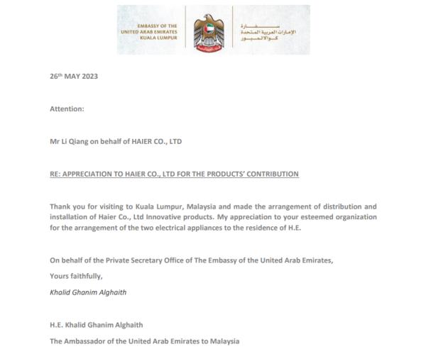 近日,海尔马来西亚收到了一封来自当地用户的感谢信,该位用户在信中表达了对海尔空调、洗衣机送装服务的由衷感谢。