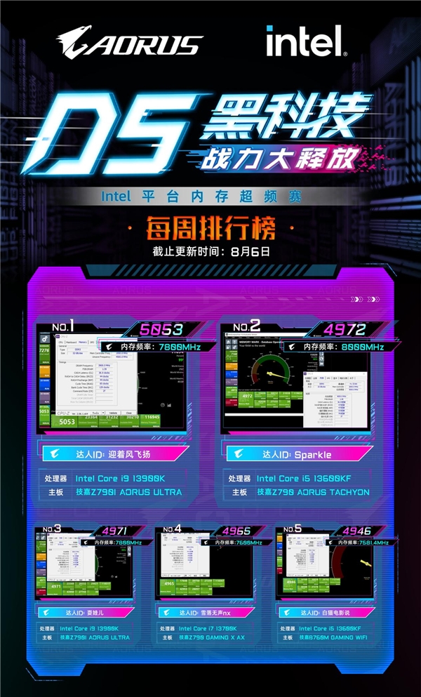 什么是超频?它对玩家意味着什么?对于普通用户来说,内存超频就是开启一个XMP的操作。但是对于真正爱折腾的玩家来说,超频是给他们带来精神上的愉悦,攀登高峰带来的成就。来到DDR5的时代,越来越多的玩家们体会到了DDR5内存所带来的超高带宽、超快速度。近日技嘉联合Intel发起了D5超频大赛,让热爱超频的玩家能够一展身手,活动首周就取得精彩战绩,下面一起来了解一下吧。