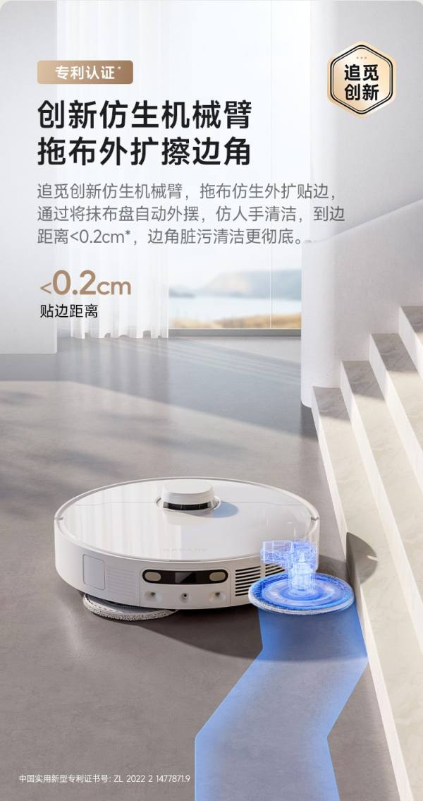 全球首创仿生机械臂首次 下放 ,首款毫米级 贴边方案, 极致贴边距离 <0.2cm ,家庭清洁无死角