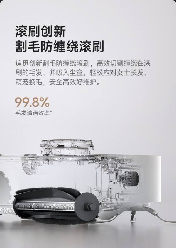 扫地机滚刷的毛发缠绕问题同样也是行业内的难题。对此,追觅S10 Pro Ultra机械臂版采用了全新的解决方案——行业首创主动式割毛防缠绕滚刷,解决头发缠绕烦恼,无需频繁清洗滚刷。航天级精钢刀头,保证了强悍的切割性能,同时具有高硬度、高耐磨性和高抗腐蚀性等卓越优点,长久使用也不易卷刃。不仅如此,追觅科技还创新地在割毛防缠绕滚刷上使用三组刀头,避免了行业以往单刀头缝隙过大的毛病,拥有更强更细致的毛发切割能力,不卡发无拉扯,毛发清洁效率达到99.8%。安全性上也无需担心,追觅S10 Pro Ultra机械臂版内置特别传动结构,并且将梳齿间隔降低至1mm,不卷入电线、USB 线、毛线等其他任何线束,确保只解决毛发,保证儿童、宠物的绝对安全,也丝毫不会对地面、地毯等造成伤害。