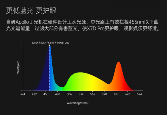 大家在追剧的时候,最烦恼的就是光线对眼睛的影响,如何带给用户娱乐的同时,还能营造健康的生活方式,是投影仪的思考方向,目前来看,除了漫反射原理之外,还会有一些新的技术出来,例如环境光自适应、智能防射眼,以及少量品牌型号,选择了技术手段来解决蓝光问题,还是以大眼橙X7D Pro为例,它通过在光机里面装配了滤光片,过滤大部分455nm以下的有害蓝光,让投影仪从光源处便做了优化,实现更健康的观影需求。