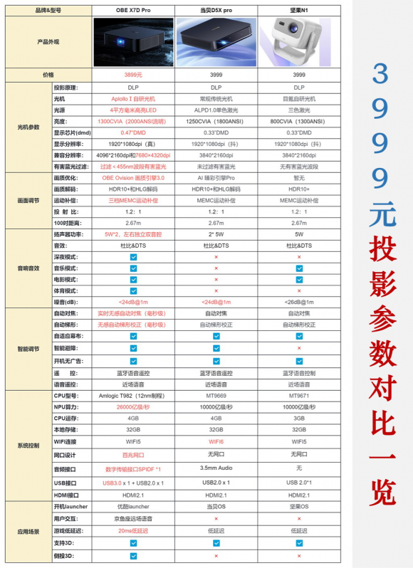 从上面三款投影仪的基础参数可以看出,三款产品都在3999元的价位,但是配置上略有不同,这三款中比较有代表性的还是大眼橙X7D Pro这款,相对坚果N1和当贝D5X这两款投影仪,大眼橙X7D Pro投影仪的亮度更高、清晰度也更高,并且系统芯片的算力也更高,等等。最明显的便是DMD芯片,俗话说的底大一级压死人,在同等价位上,一颗0.47DMD芯片,相对0.33DMD芯片的优势,可以说是碾压式的,清晰度水平明显更高。