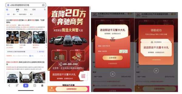 以北京腾达庆红销售服务经销商的“1元试驾“活动为例,当用户在百度APP搜索“v260奔驰商务车价格“等关键词时,即可通过引导链接进入落地页,查看当前车型的最新优惠信息,并通过经销商送出的“千元蟹卡大礼”激励实现留联并到店体验(活动持续进行中,欢迎搜索领取到店大礼!)
