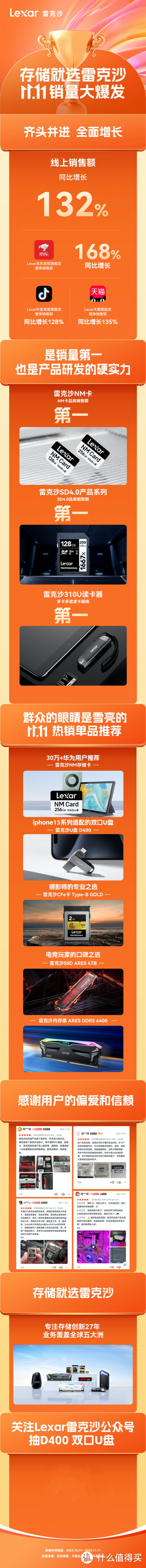 据悉,Lexar雷克沙产品此次双十一线上销售额同比增长132%,在多平台实现了销售额的大幅增长:在Lexar雷克沙京东自营旗舰店,实现了销量同比增长168%;在Lexar雷克沙抖音商城旗舰店,实现了销量同比增长128%;在Lexar雷克沙天猫旗舰店,实现了销量同比增长135%;产品销售势头强劲,多款产品卖到断货!
