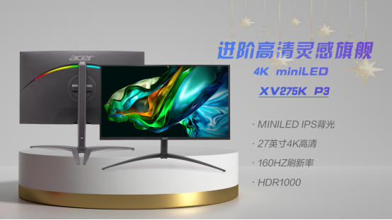 XV275K P3是宏碁暗影骑士家族的首款miniLED IPS背光显示器,自上市以来凭借自身高刷、高亮、高画质特点赢得了绝佳的口碑,拥有27英寸4K高清屏幕,160Hz刷新率,1ms(GTG)的极速响应时间,AdobeRGB 99%的色域覆盖范围,576背光分区,1000nits的峰值亮度,更有HDR1000的高配置,玩家的游戏画面可以达到非常出色的效果,流畅细腻的画质和精细的明暗细节对比让战斗画面更加逼真。XV275K P3可以满足专业创作选手对于配置升级的需求有着其他屏幕显示器无可比拟的优势。得神兵者得天下,这款集电竞和创作属性于一身的显示器一定要尽快拿下。