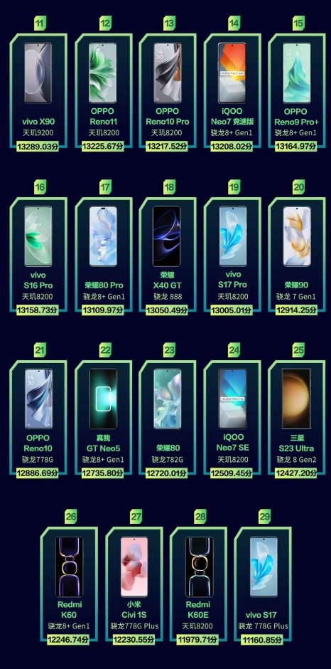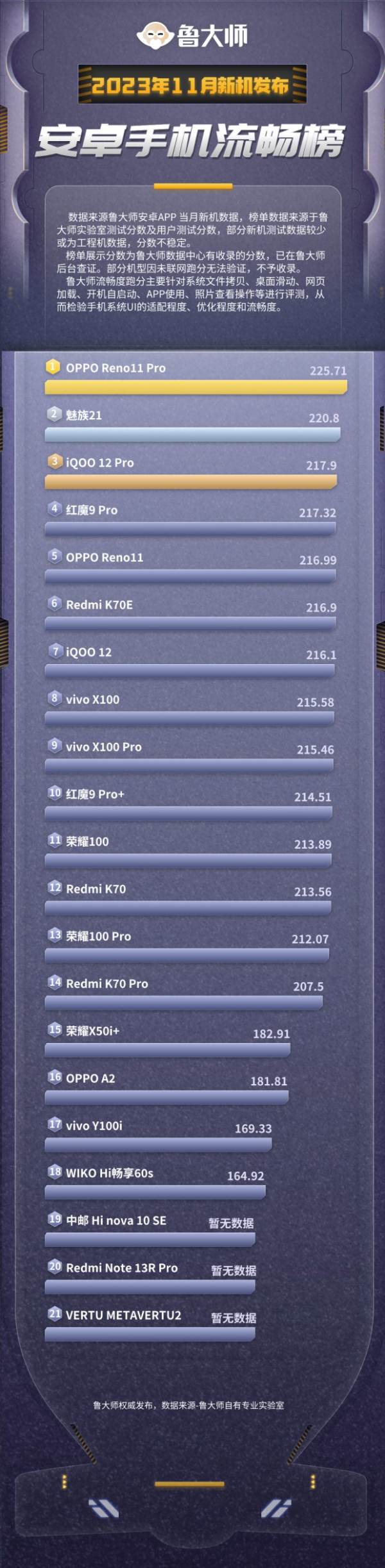 那么如果我们带着这一思路,来看看11月的鲁大师新机流畅榜,对于首发了ColorOS 14的OPPO Reno11 Pro能够夺得榜首、OPPO Reno11夺得第五的结果,就不会觉得意外了。