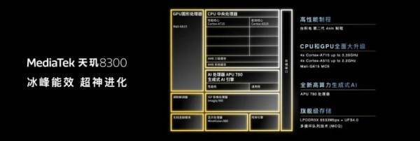 先说天玑8300-Ultra吧,它这代和天玑9300一样,走的是一个“青春版”的全大核设计。芯片本身采用台积电第二代4nm制程,基于Armv9 CPU架构,八核CPU包含4个Cortex-A715性能核心+4个Cortex-A510能效核心,对比上一代天玑8200的4个Cortex-A78大核和4个Cortex-A55小核来说,提升斐然。