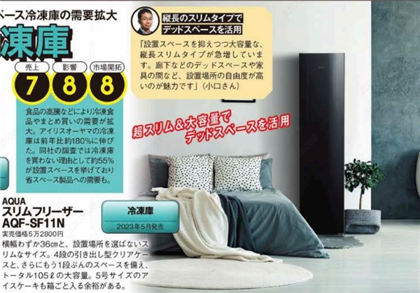 日本家电品牌众多,AQUA超声波洗衣机Prette plus、Slim冷柜能够获得认可,与其立足用户差异化需求进行的创新设计密不可分。由于衬衣衣领和袖口、宝宝衣服上的顽固污渍特别难清洗,洗衣时多数用户都会手洗处理一下衣领、袖口等难清洗的部位。AQUA洗衣机带有行业首创的超声波局部清洗功能,30秒就能去除衬衫衣领、袖口上的顽固污渍,减轻了用户洗衣负担。另外,日本用户住居面积较小,产品尺寸过大家中摆放不开,AQUA Slim最瘦冷柜宽幅仅36cm,减少占地空间的同时又能实现大容量存储,契合了日本用户需求。