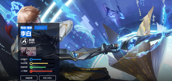 6.鸣剑·曳影:这款皮肤属于荣耀典藏系列。在技能特效方面,“青莲剑歌”释放时会有金、蓝两色光芒交织;“将进酒”第一段突进后增加留白效果;强化普攻金色特效与光效;二技能和大招的剑阵更加明显。