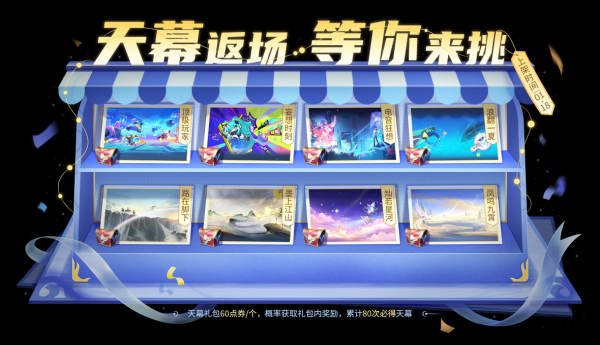 上架礼包:浪翻一夏天幕礼包、路在脚下天幕礼包、墨上江山天幕礼包、灿若星河天幕礼包、凤鸣九霄天幕礼包、顶级玩家天幕礼包、妄想时刻天幕礼包、电音狂想天幕礼包
