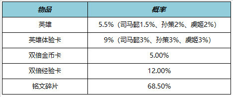 打开后可随机获得以下奖励之一:司马懿、孙策、虞姬、英雄体验卡3天、双倍金币卡:1日、双倍经验卡:1日、188/138/108铭文碎片。