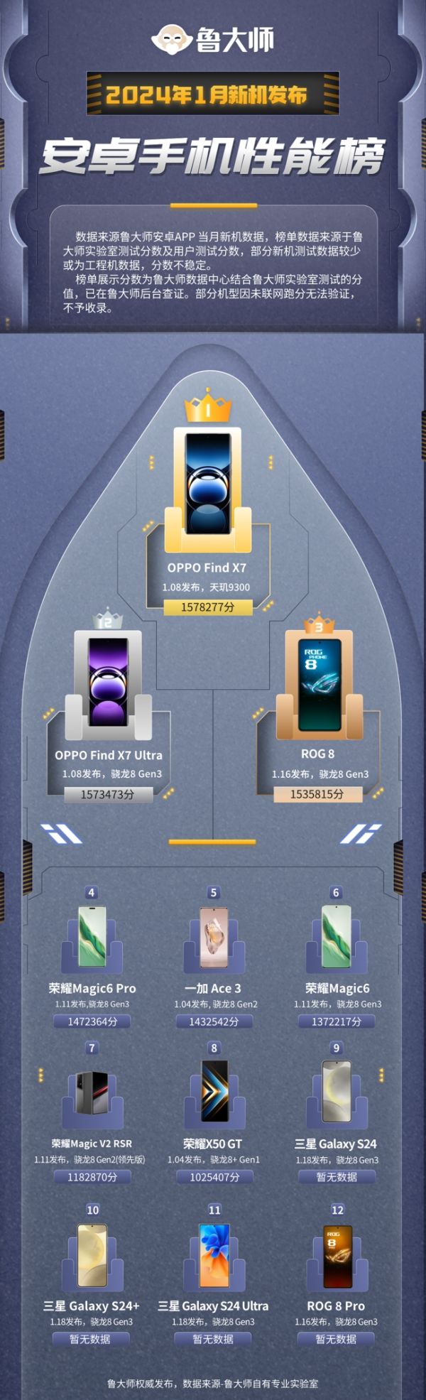 最终,OPPO Find X7以1578277分的总成绩,夺得了鲁大师2024年1月新机性能榜单的冠军。