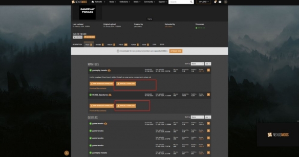 打开N网选择你希望安装的Mod,服务器支持的Mod一般是功能性,调整数值为主的,此处以一个我认为神器的Mod进行介绍。 gameplay tweaks 打开链接,完成两部分文件的下载,分别是Mod主体文件和依赖文件,如下图所示。
