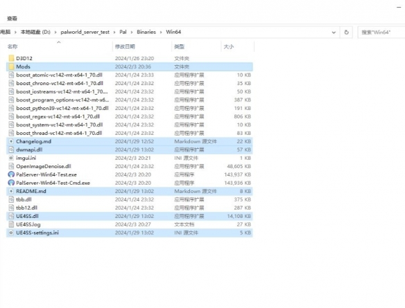 将压缩文件解压,并且放置至对应服务器文件夹路径下的 /Pal/Binaries/Win64 文件夹下,对应关系如下图所示。