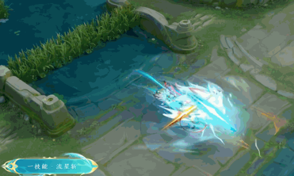 一技能:亚连向前释放刀光,满印记状态下白狼魂破空而出!地面出现莲花或武器为设计点的装饰花纹并伴随冰雪粒子拖尾。