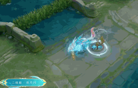 二技能:亚连化为白狼向前冲刺,周围伴有风雪粒子拖尾 。被击中的敌方会被风雪环绕,地面会出现莲花图腾装饰花纹。